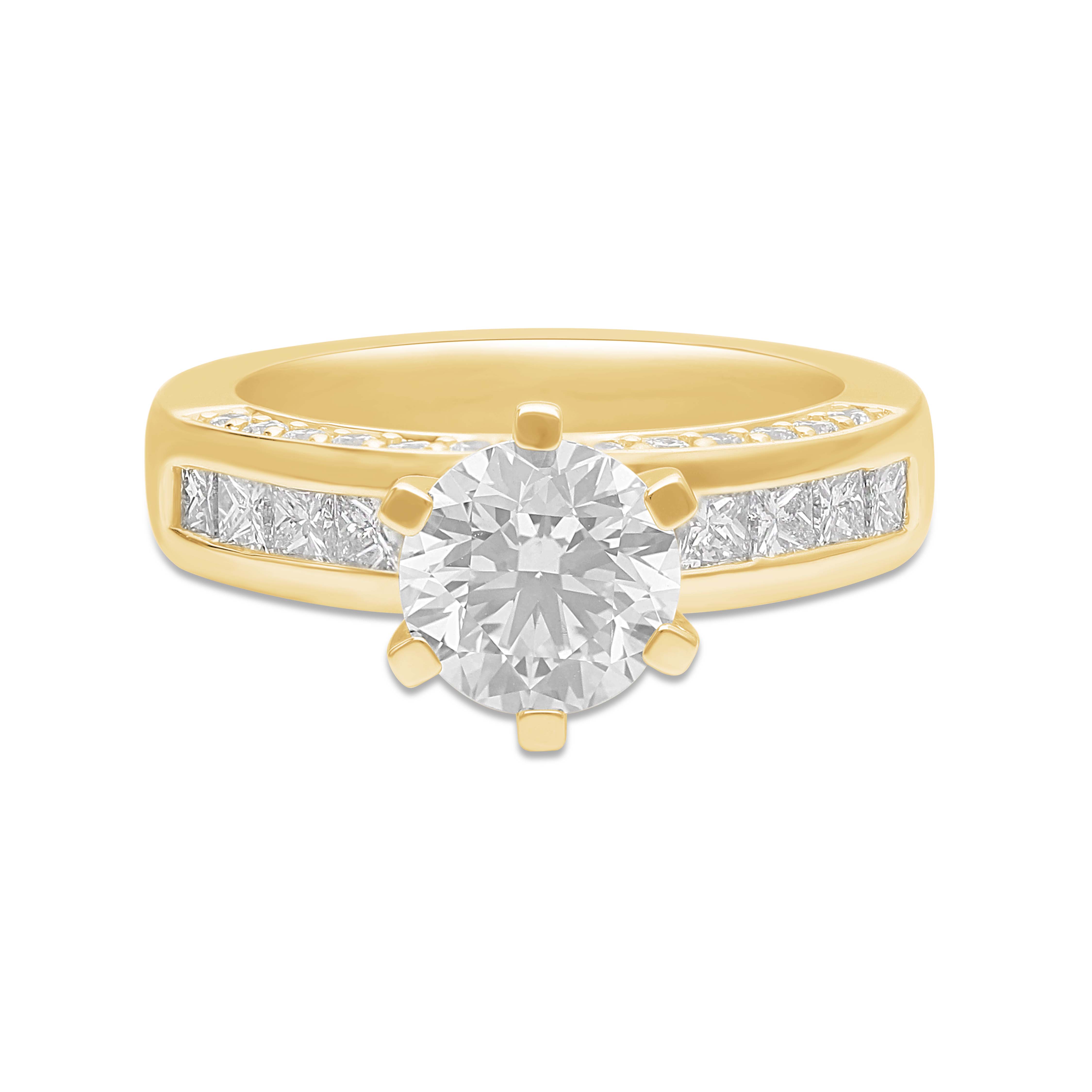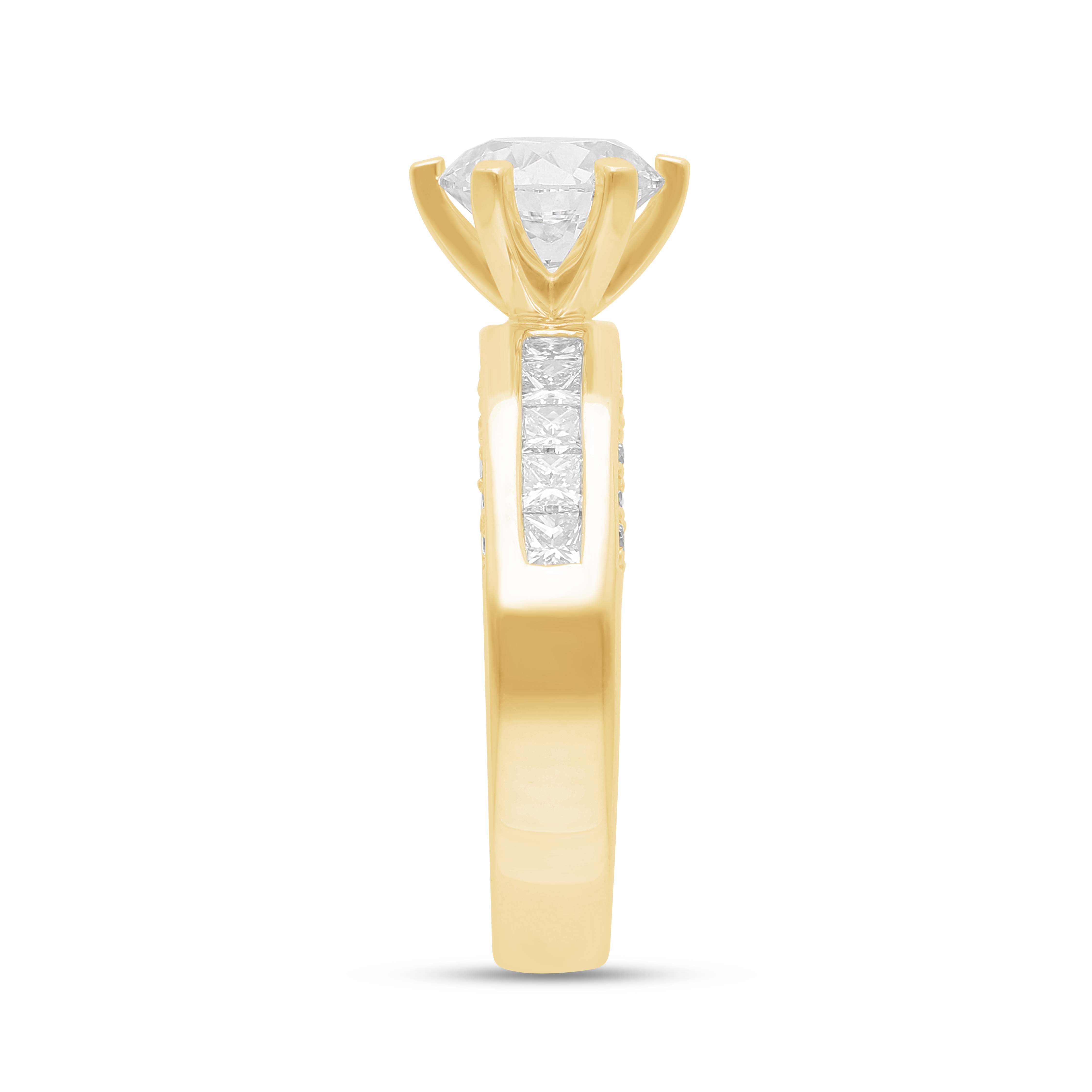 A captivating 14k gold ring that celebrates commitment with a radiant round solitaire and twin rows of glittering channel-set diamonds crafted to mirror the strength, purity, and enduring glow of true love.