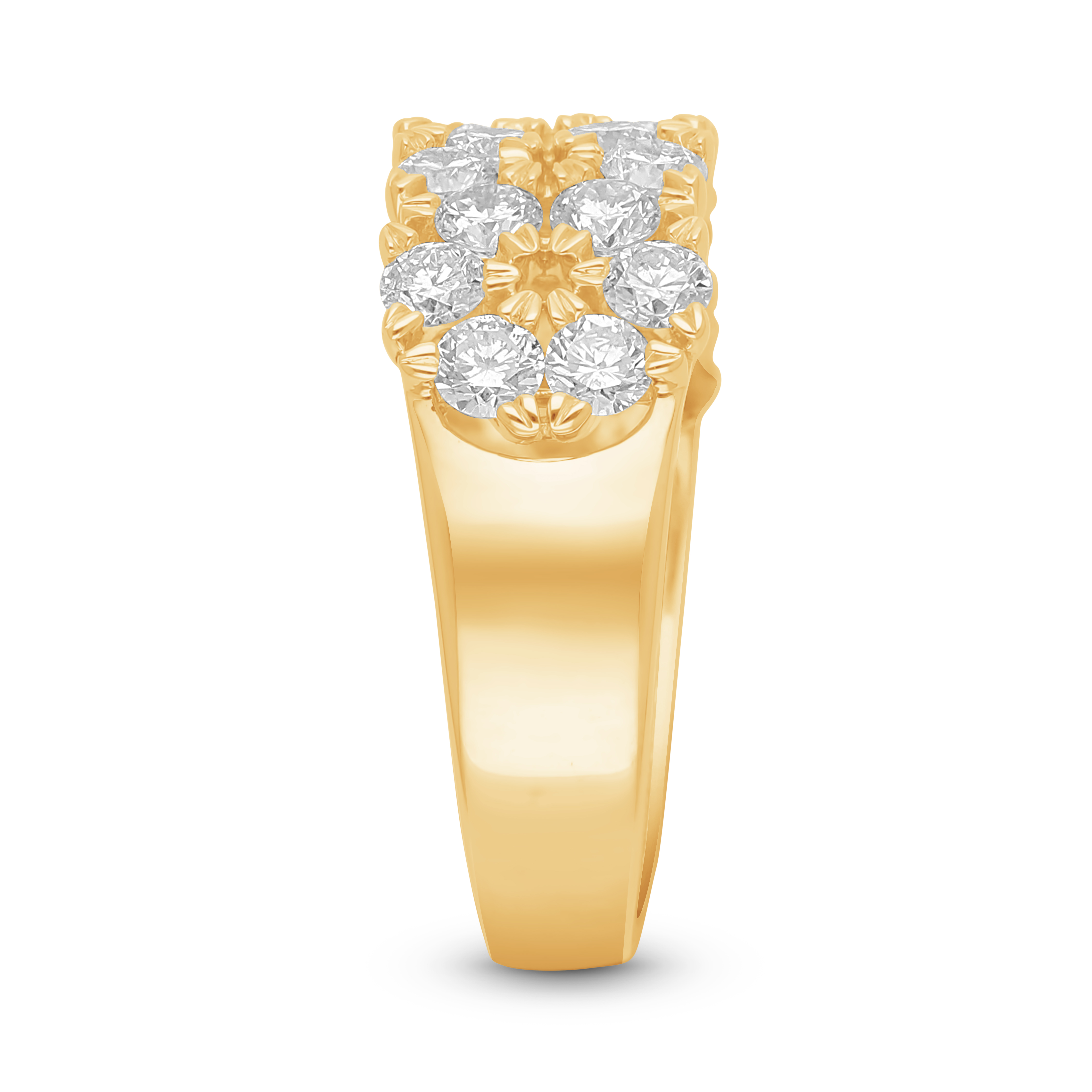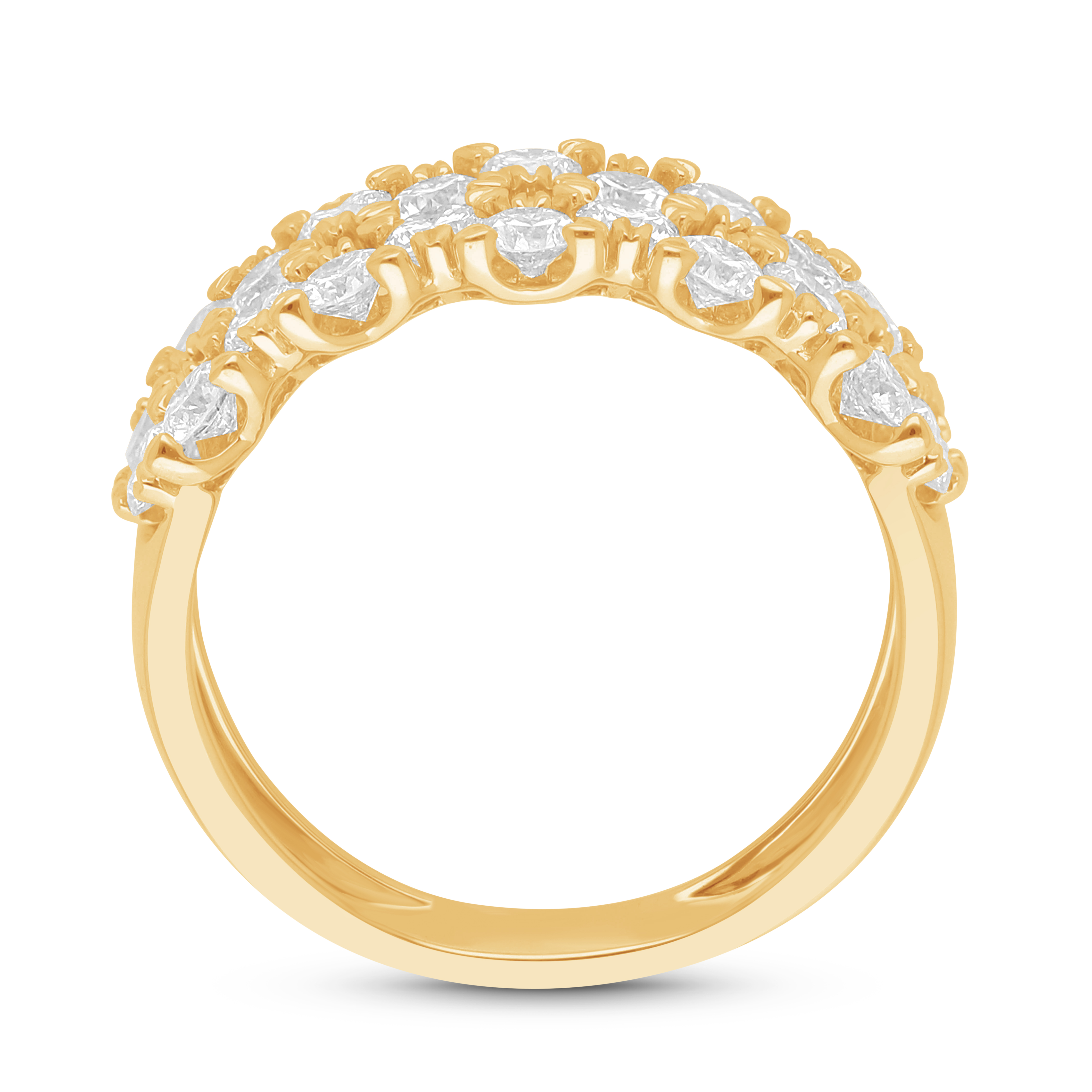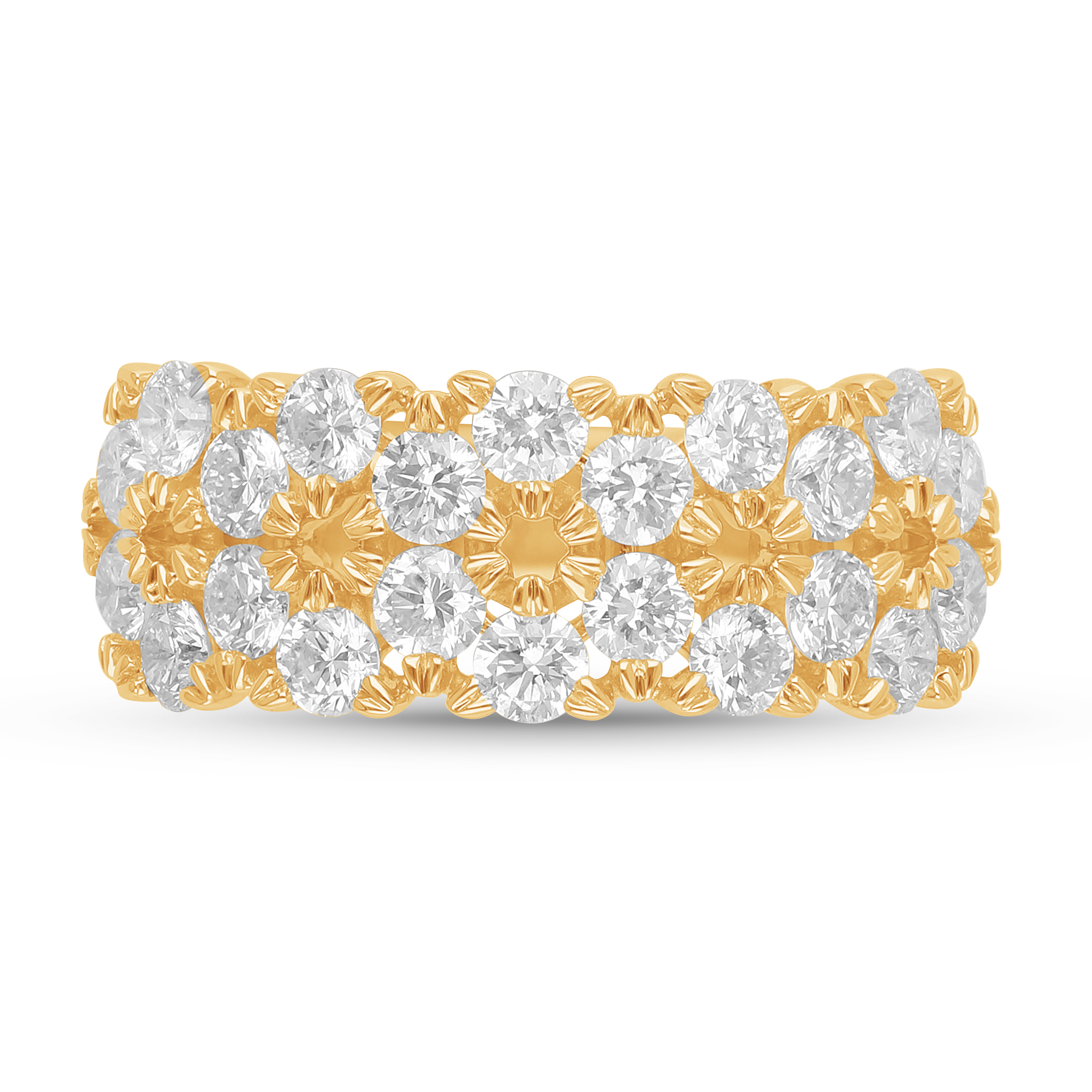This magnificent gold band is intricately woven with three sparkling rows of fiery, round brilliant diamonds. The textured setting forms a dazzling, continuous tapestry of light, creating a luxurious statement piece that celebrates a grand, enduring love with opulent glamour and unmatched presence.