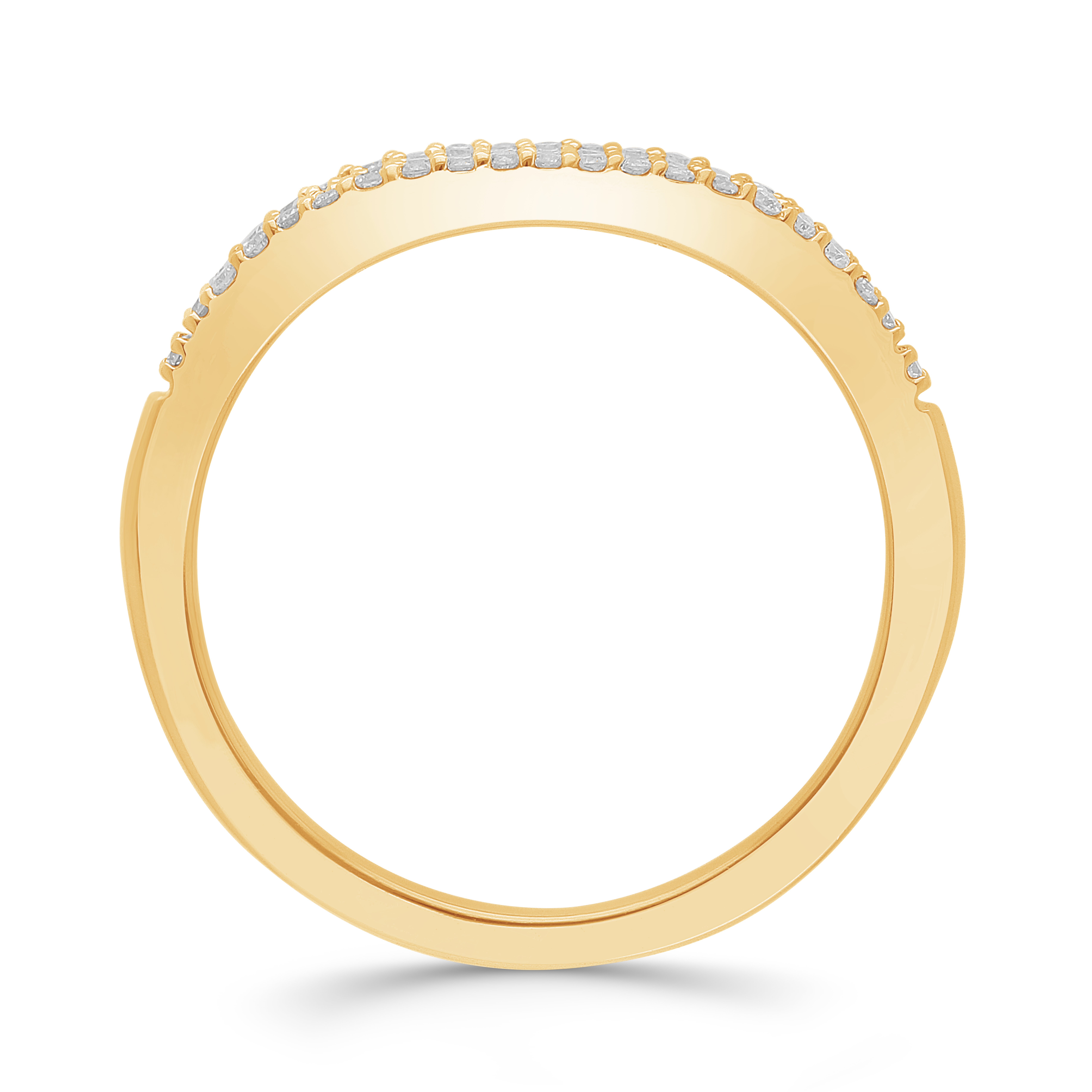 A sleek yellow gold band crowned with a luminous expanse of round brilliant diamonds set in rich pave. The elongated surface creates a concentrated field of light, embodying pure, uninterrupted glamour and focused brilliance.
