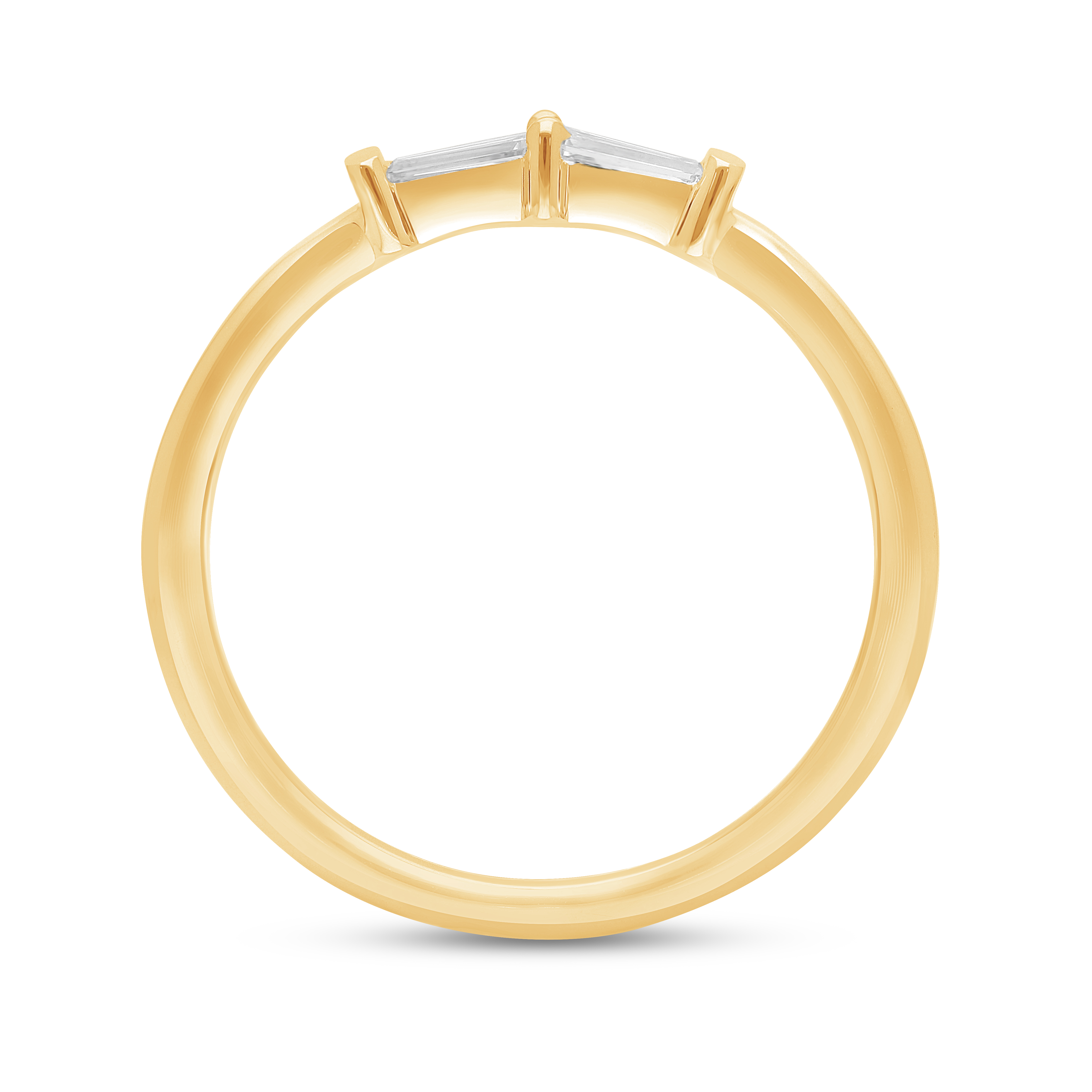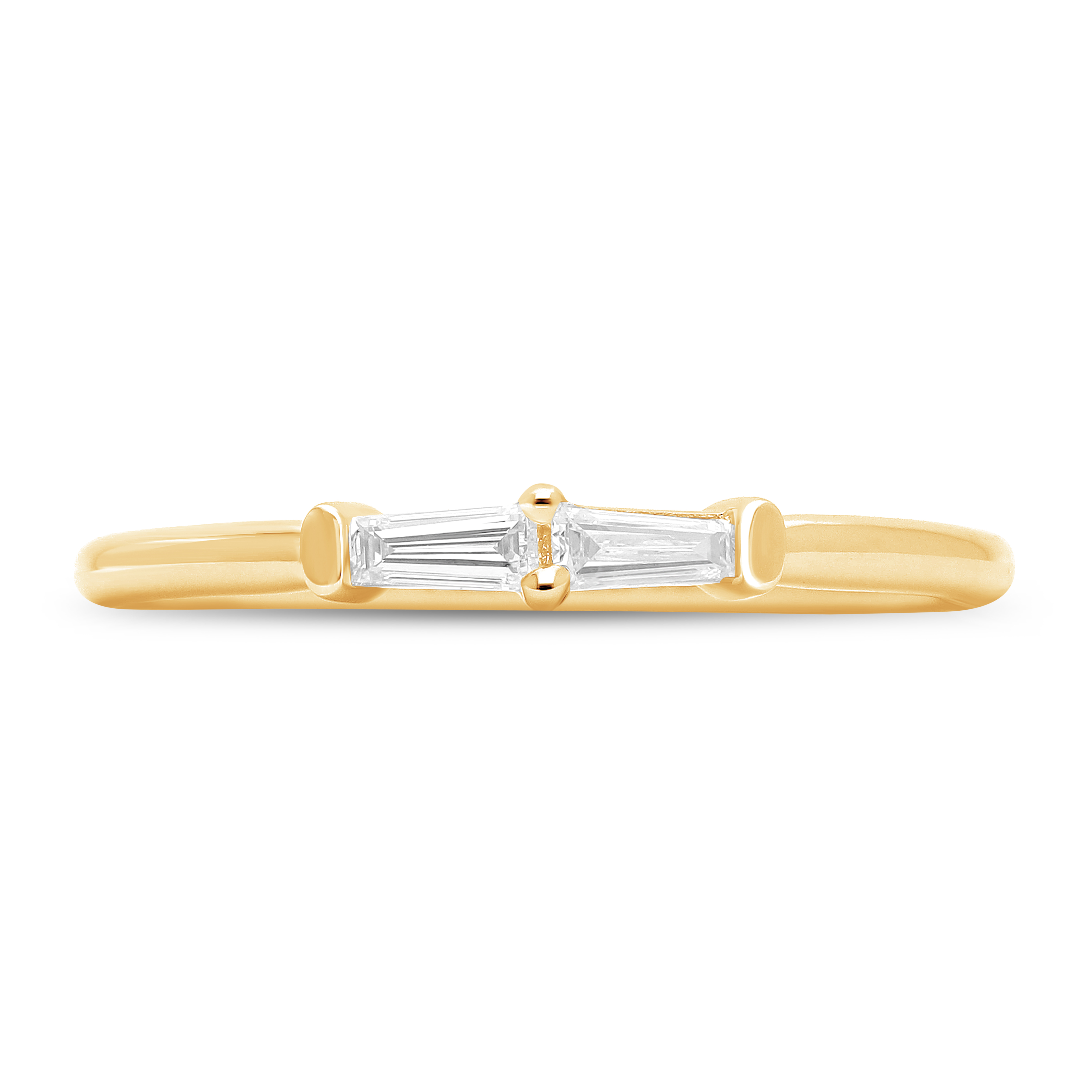 Two luminous baguette diamonds, perfectly balanced and separated by a single brilliant point, rest on a smooth yellow gold band. This delicate ring embodies quiet symmetry, modern harmony, and focused, understated light.
