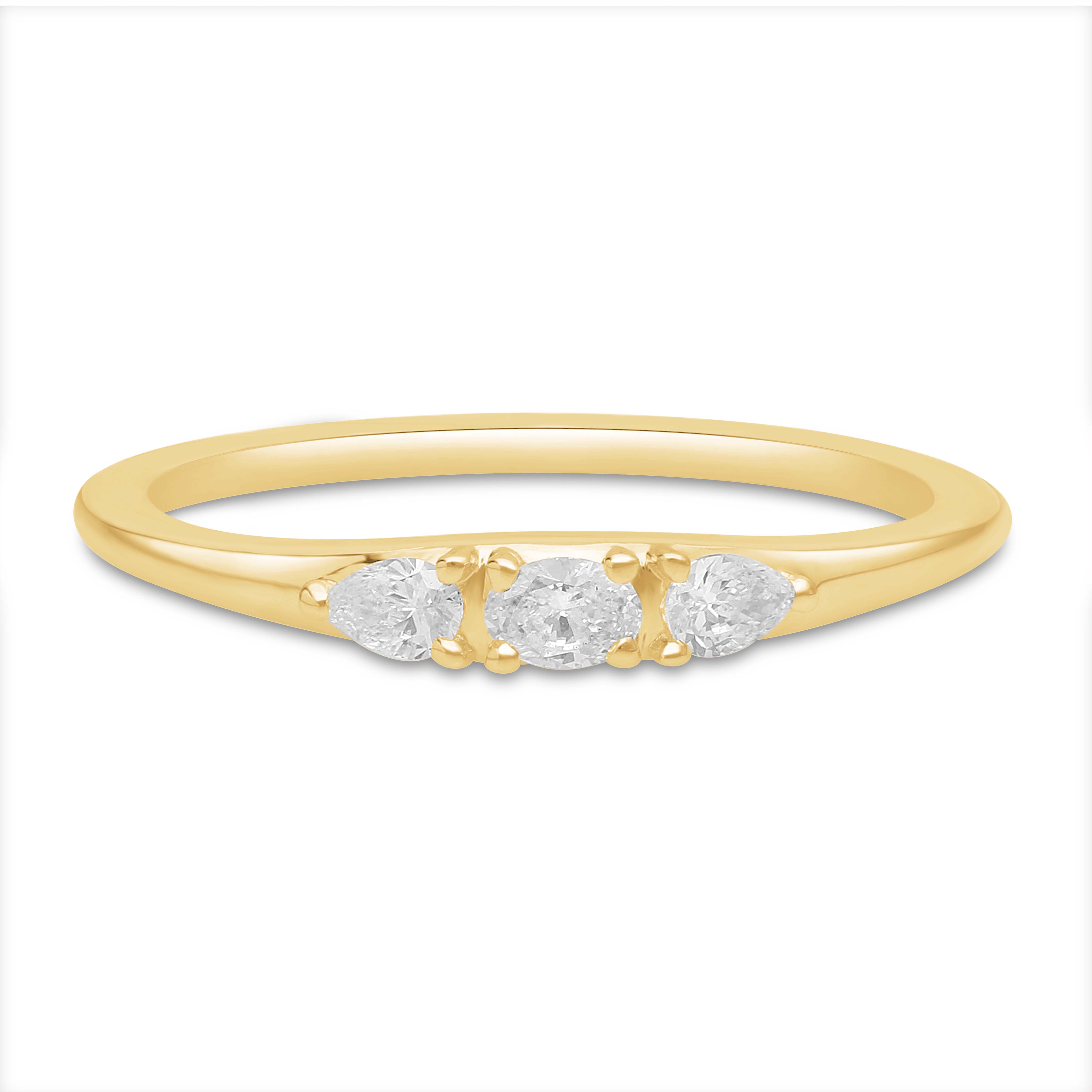 This stunning 14K Gold ring features a brilliant oval centerpiece flanked by luminous pear-cut diamonds. The elegant flow of the three stones symbolizes the beautiful, continuous sweep of a shared lifetime-past, present, and future glittering with profound, focused clarity and grace.
