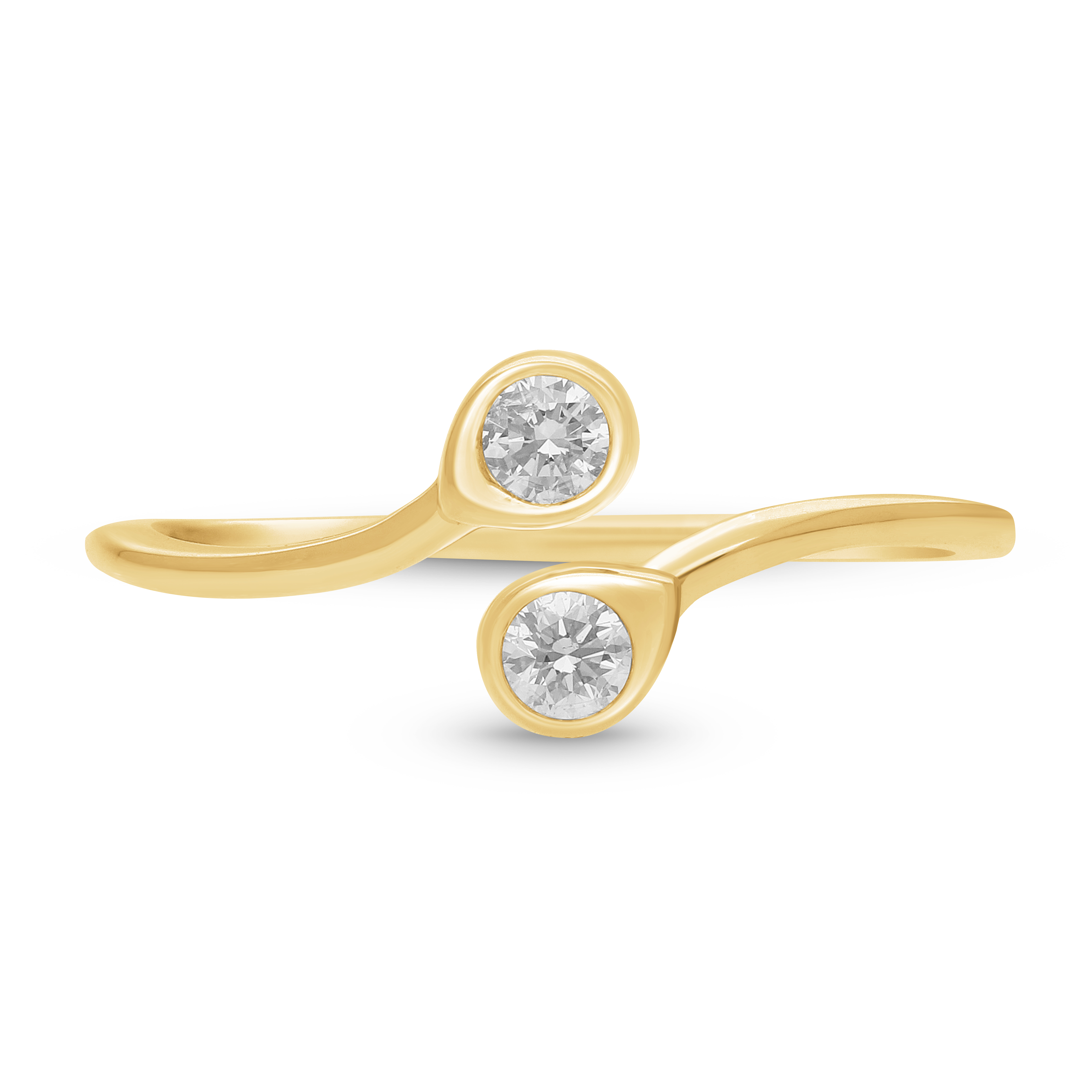 A unique, fluid bypass design featuring two brilliant bezel-set diamonds encased in teardrop frames. This stylish open ring offers a modern, chic look with subtle sparkle.