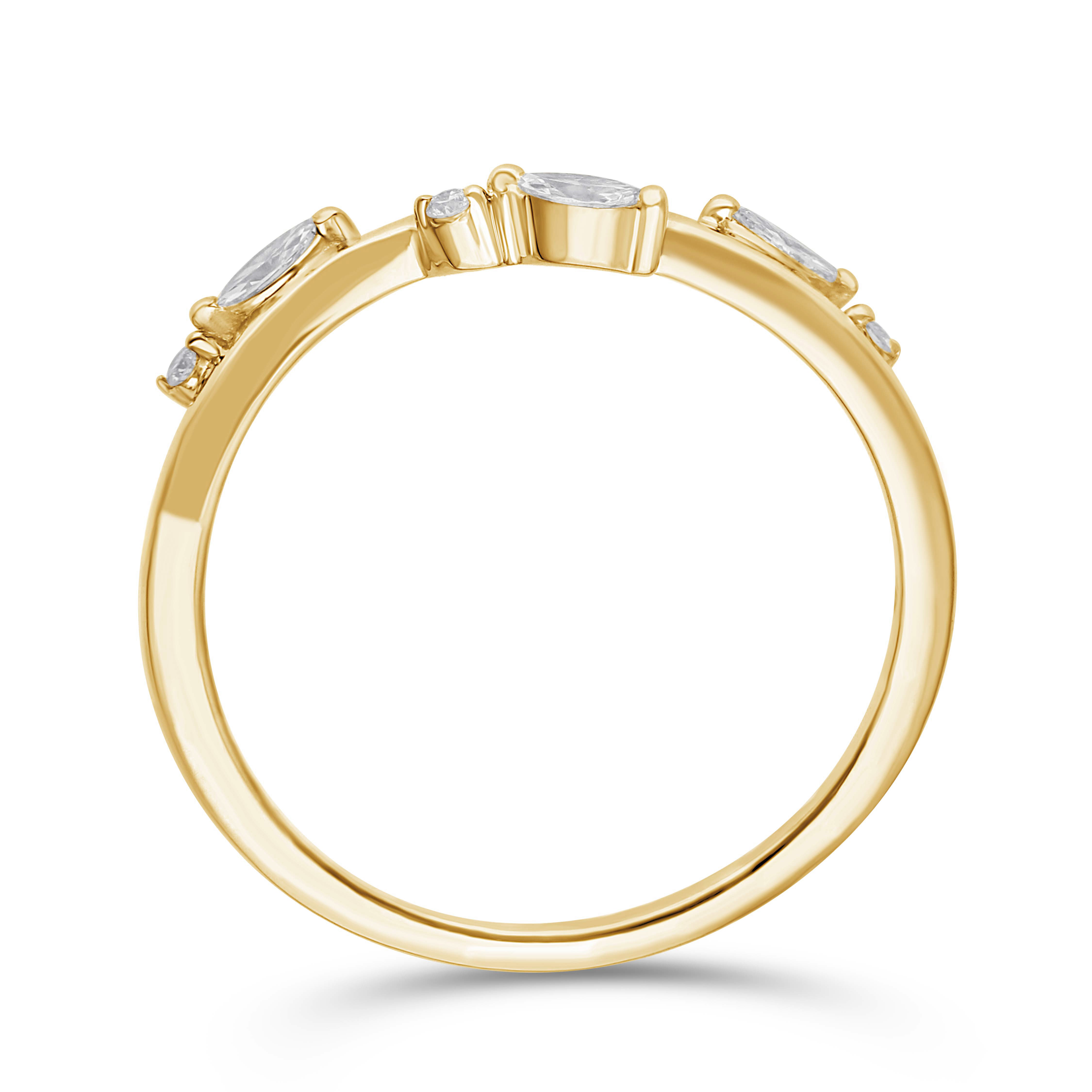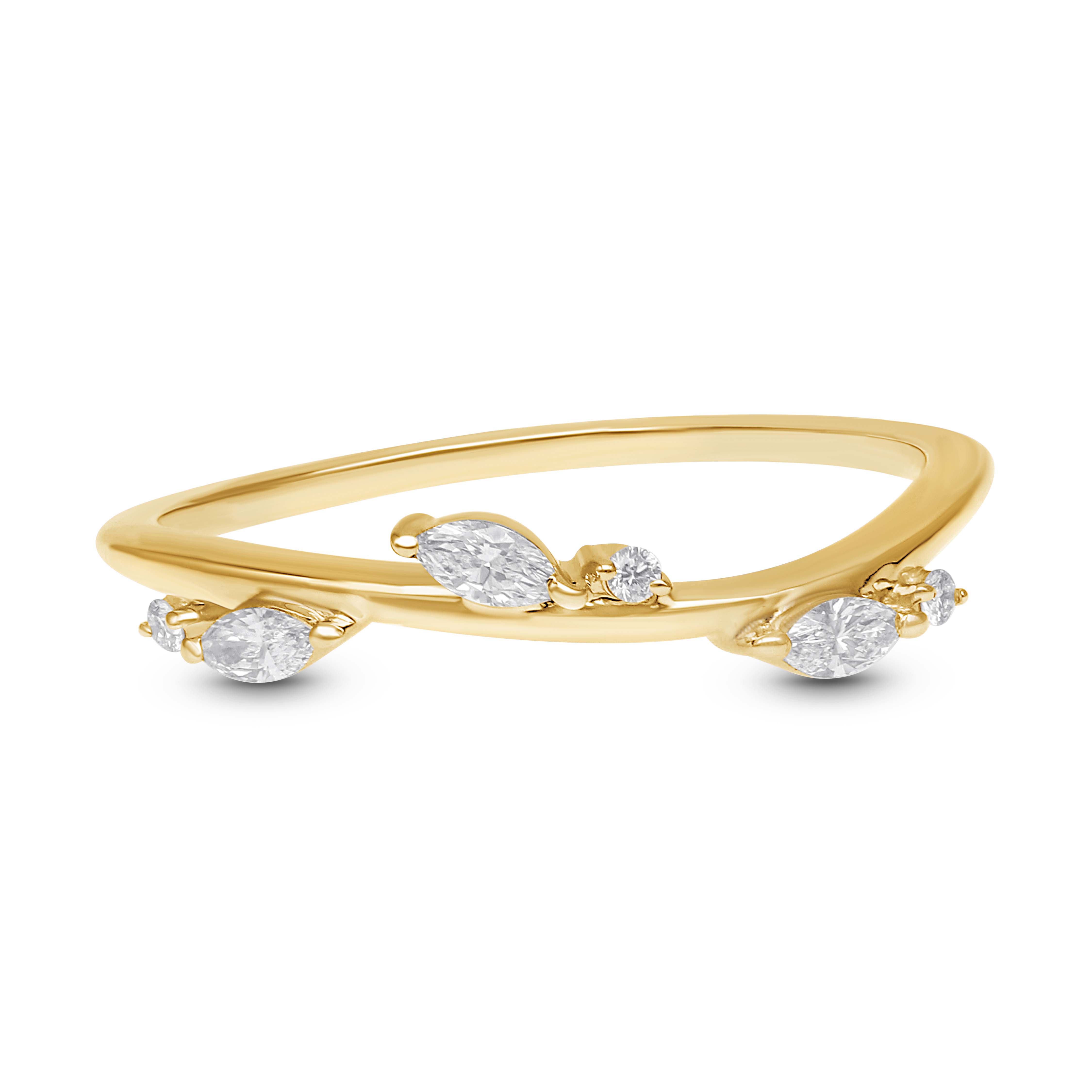 A graceful 14k gold contour ring adorned with marquise and round diamonds, gently tracing the finger’s curve. Its poetic silhouette adds a touch of refined sparkle, perfect alone or paired in harmony.