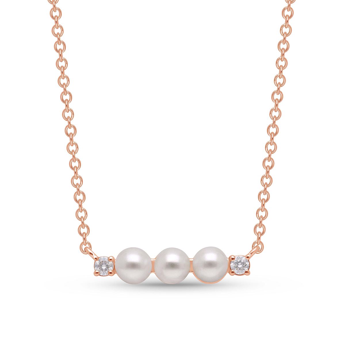 Three luminous pearls dance in a row, accented by sparkling diamonds (0.07 carats total), crafted in gleaming 14k gold