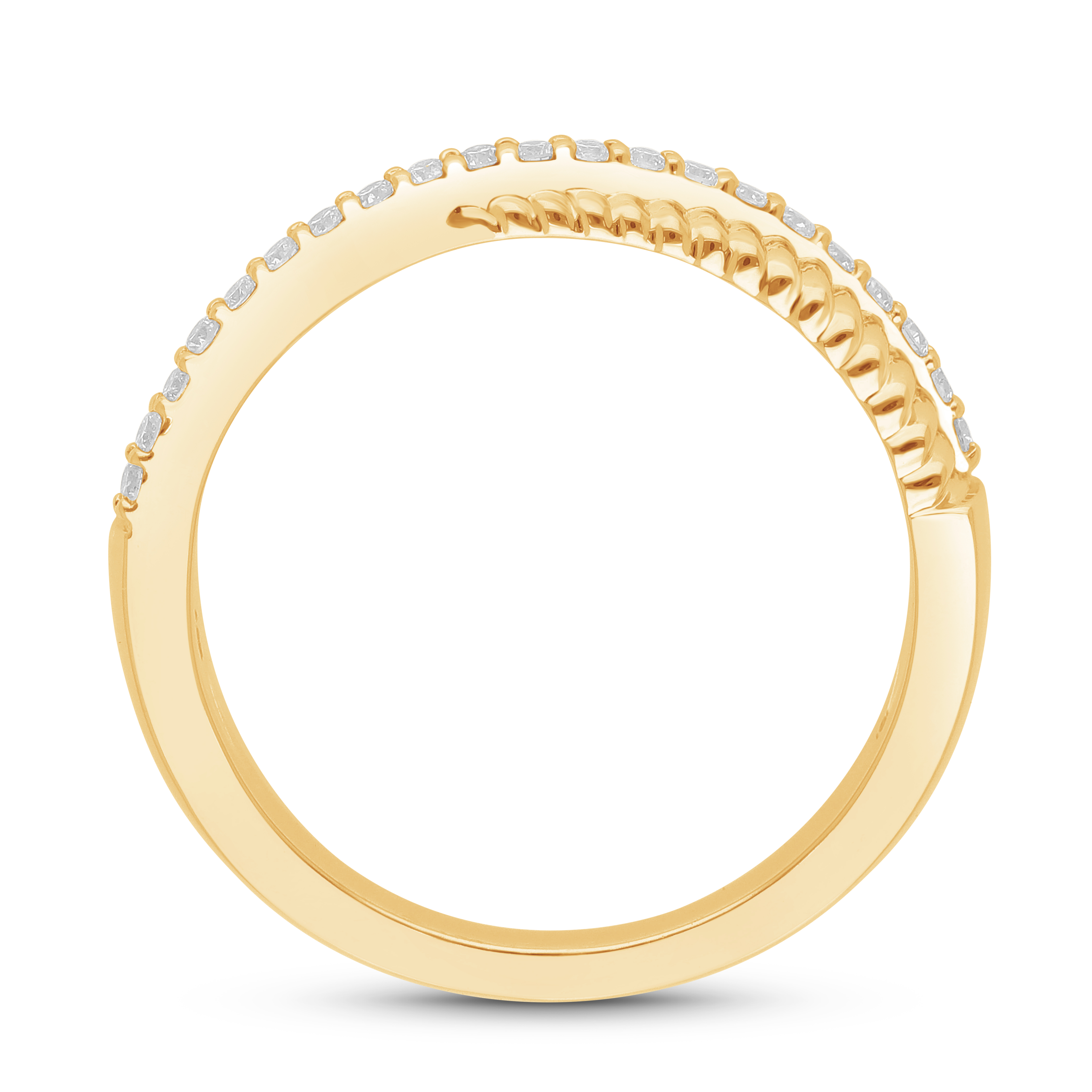 Effortless, contemporary elegance. This delicate band features a continuous line of bezel-set diamonds that alternate slightly in size, creating a unique, charming stitching effect perfect for stacking.